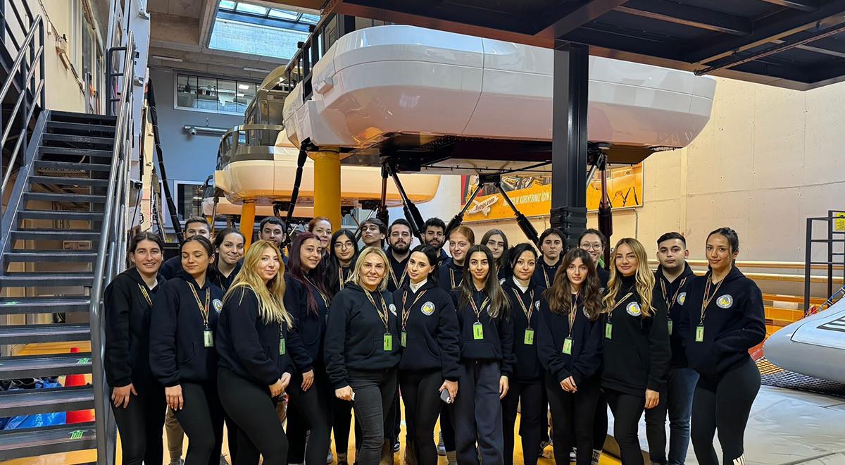 The mock-up training in question which took place at Pegasus Airlines Training Center included topics such as fire extinguishing, use of emergency equipment, emergency scenario training in flight simulator and life-saving in water. During the training series delivered by Pegasus authorities and EMU Civil Aviation Cabin Services Program specialist academic staff member Aslı Akı and Sonuç Hacıoğlu, students got the chance to experience emergency situations thanks to the applied practices with the simulators, and the steps to be taken in such events. Within the scope of the training, possible situations that can be experienced in the case of a risk in the sky, a forced landing on the sea or on land and, steps to be taken in such circumstances were taught to students. In the mock-up training, the training of opening and closing the doors on the planes was carried out practically for students. Students also received training on how to react in emergency situations such as fire, discharge of pressure, forced landing, failure of landing gear or breakage during flight.